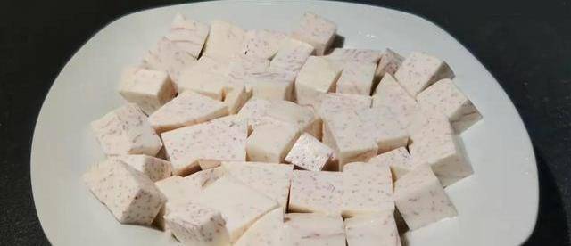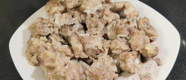 排骨段准备好了,下面就开始准备配菜芋头。荔浦芋头清洗干净,然后用削皮刀去皮后切成小块。放入大碗里,倒入调味品充分搅拌均匀,腌制十五分钟左右。这样被腌制芋头吃起来更佳有味。荔浦芋头中含有一种粘液蛋白,在被人体吸收后能产生免疫球蛋白,提高身体的抵抗力,因此芋头可以解毒,对人体的癌毒有抑制消解作用,可以用来防治肿瘤等疾病。
