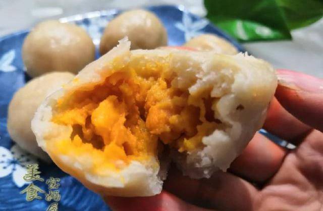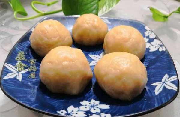 4、取一小块山药面团,在手心团成圆球,压扁,如果面团粘手的话就粘点淀粉,然后用勺子舀入少许红薯泥,虎口收口,团成圆球,依此方法再做好四个山药红薯球,放入盘中,上蒸锅蒸10分钟后取出,就可以直接食用了,香甜软糯,非常的好吃又美味。