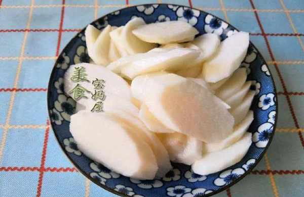 1、把准备好的1根山药,一切为二,冲洗干净,用刮刀刮去外皮,切成薄片,装入盘中,然后再把准备的1根红薯清洗干净,刮去外皮,也切成片,装入盘中备用。