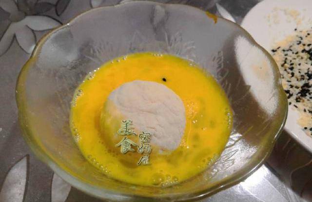 5、也可以裹上面包糠和黑芝麻,放入油锅中炸着吃,在碗中打入一个鸡蛋,用筷子搅拌混合均匀,然后取一小块山药面团,粘点淀粉,用手团成圆球,压扁包入红薯泥,同样虎口收紧口,团圆,再放入搅拌好的鸡蛋液中滚一下,取出放到面包糠和黑芝麻中,裹上层面包糠和黑芝麻,轻轻按压一下就可以了,也可以把它直接团成圆球,依次把其它的面团也分别包入红薯泥,裹上蛋液、面包糠和黑芝麻,备用。