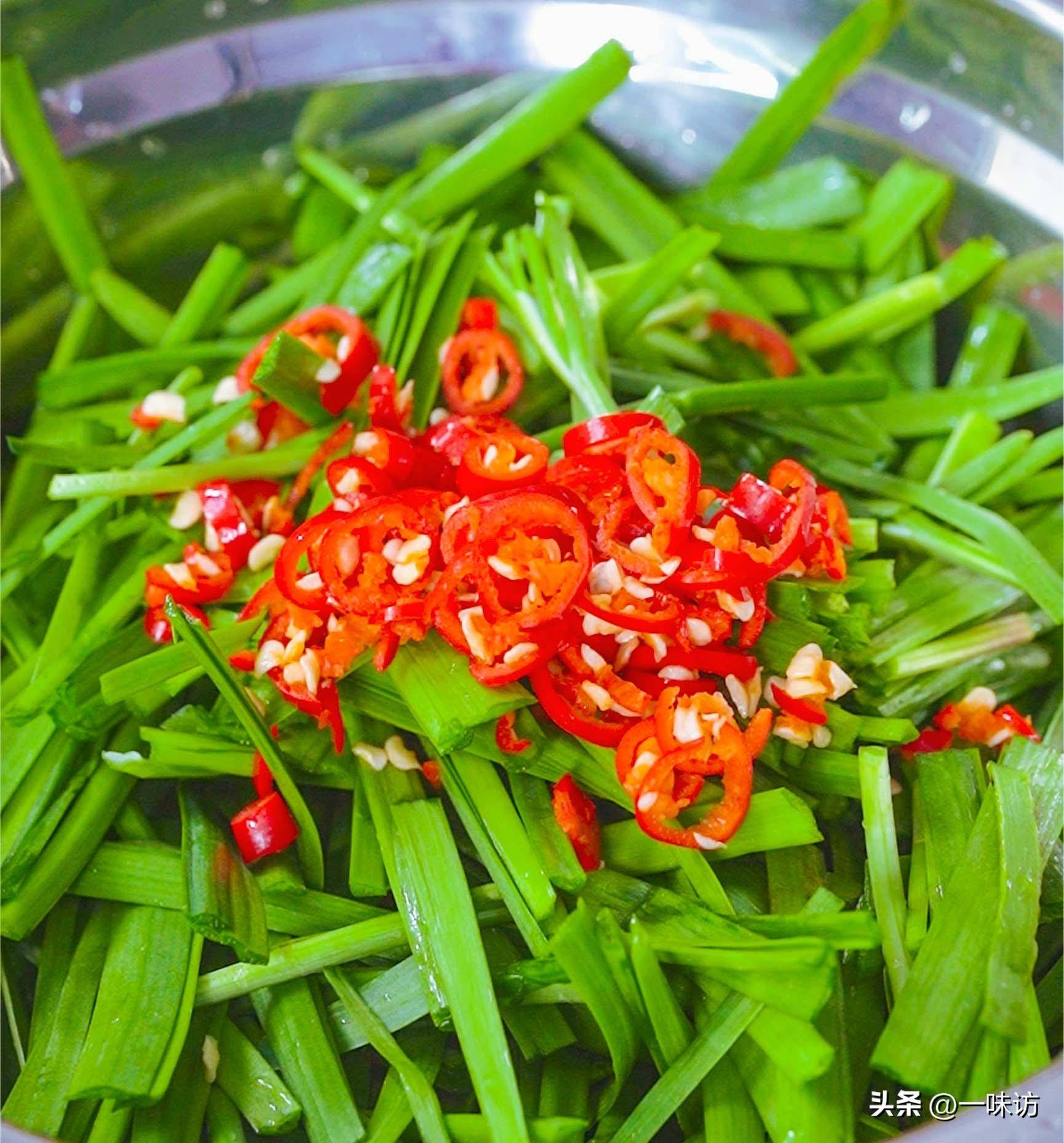 然后再在另一个盆中准备一些韭菜段,一些新鲜的小米辣,然后等待备用。韭菜一定要新鲜,这样无论在色泽上,还是在味道上都能满足人们的基本饮食需求。