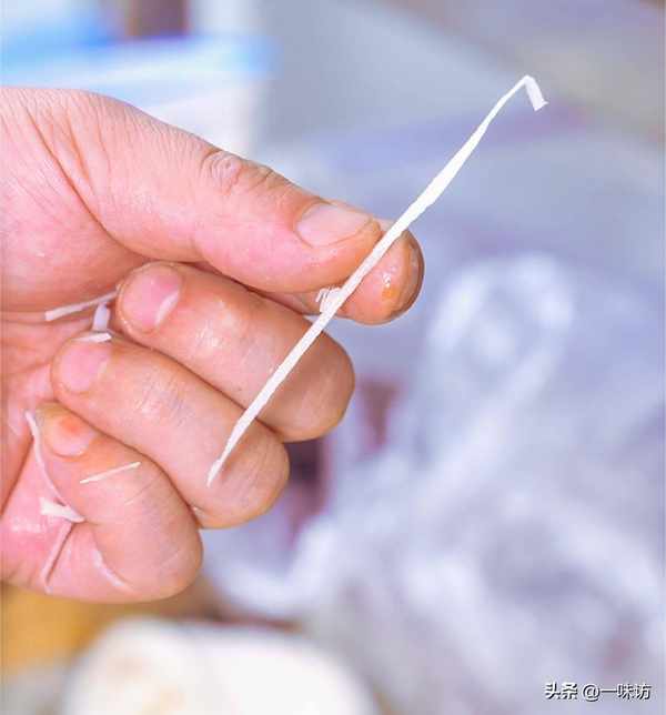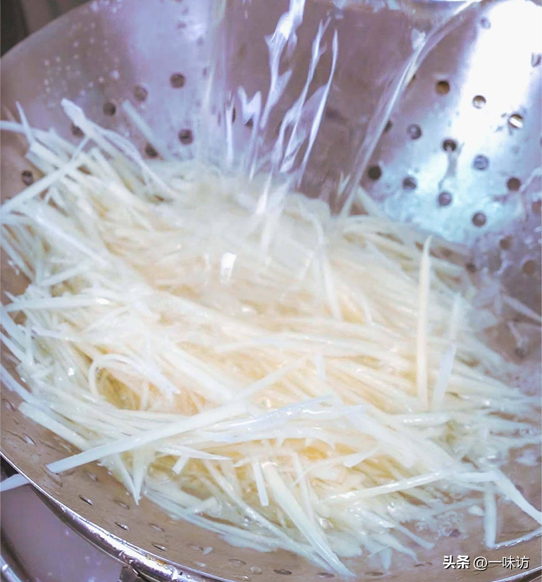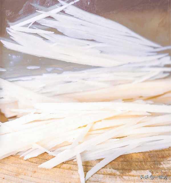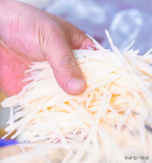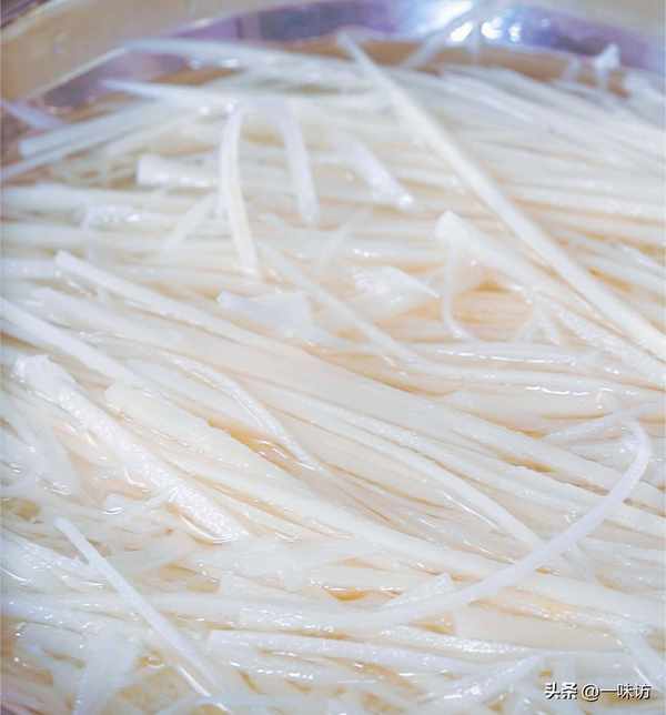 切丝的时候它很容易断,炒得时候也容易断,顺切之后再改刀成牙签粗细的丝,然后将其下入清水中浸泡。