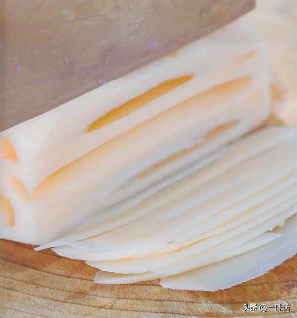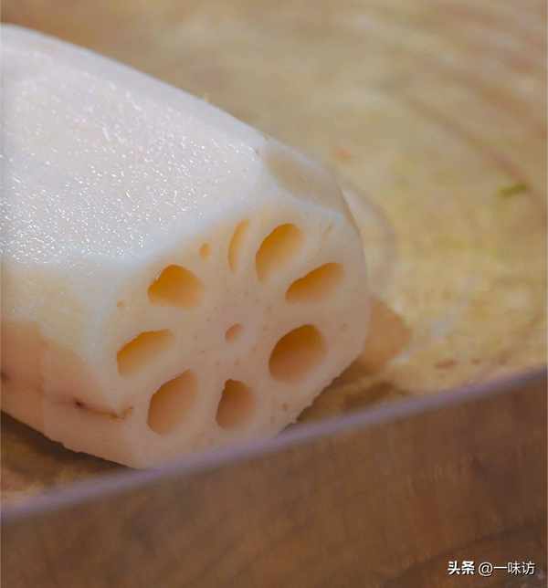 改刀成片,改刀时一定要顺着切,这样做的目的是防止莲藕再改刀。