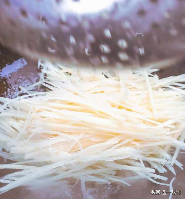 2、切好的莲藕丝一定要在清水中认真清洗,才能将其淀粉含量清洗掉,一方面确保健康饮食,另一方面是清脆爽口的保证。