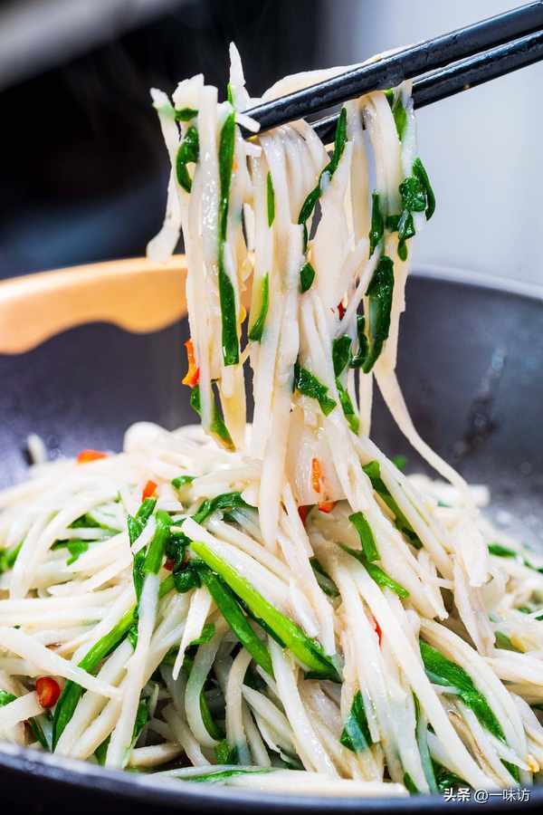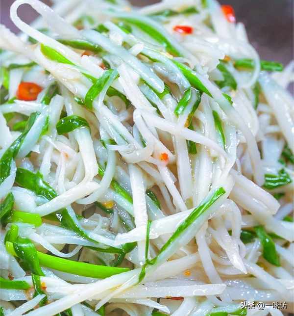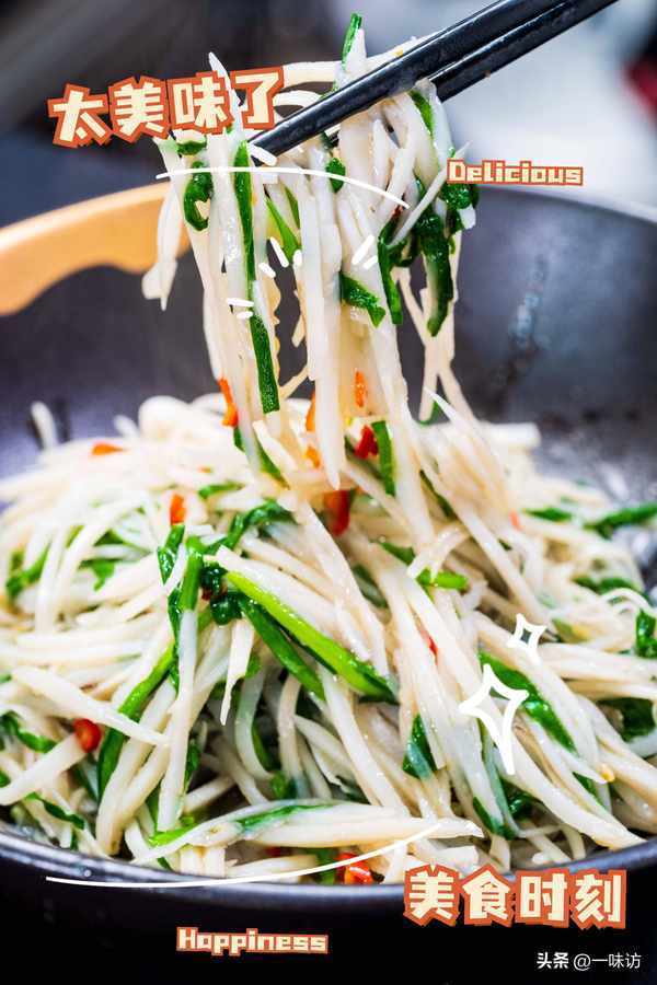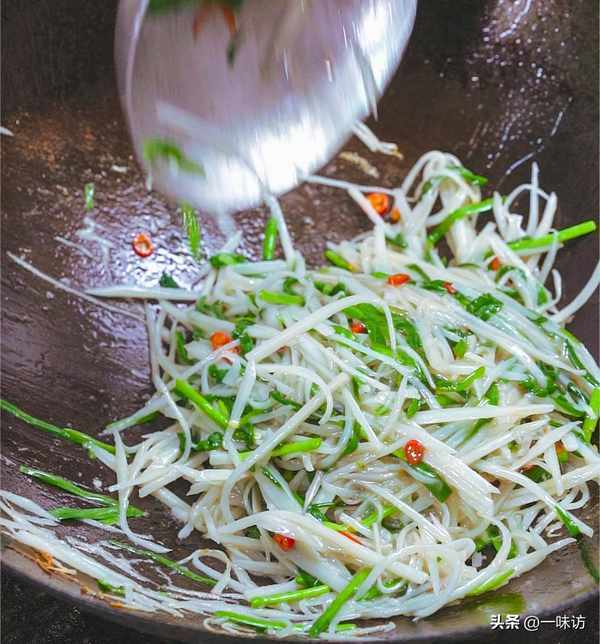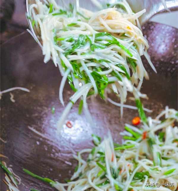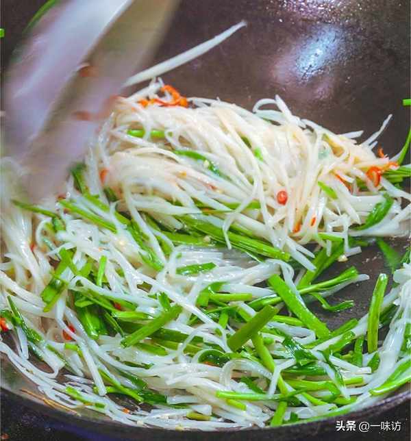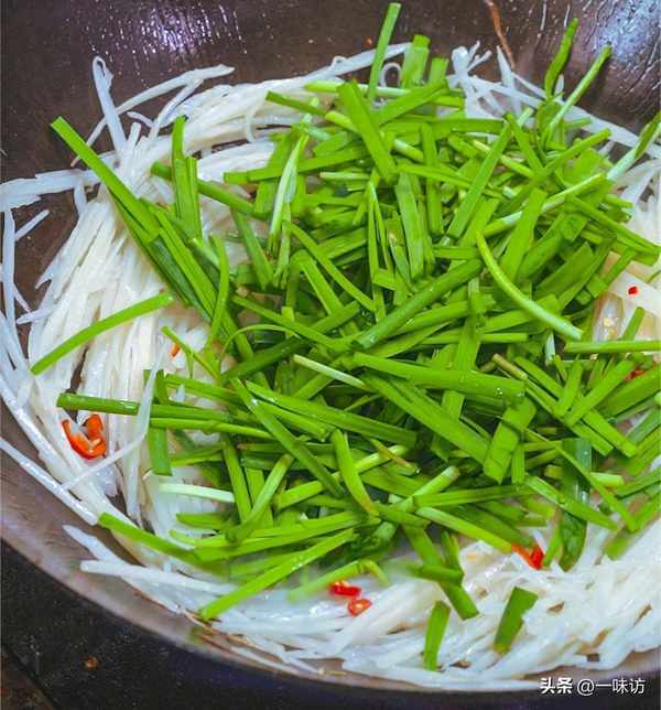 3、翻炒过程中,注意翻炒顺序,先是藕丝下锅,再然后才是各种调料入味,然后在炒至半熟后,加入备好的韭菜段,进一步激发出香味,最后在小米油的加持下,这道菜的味道才逼进完美。