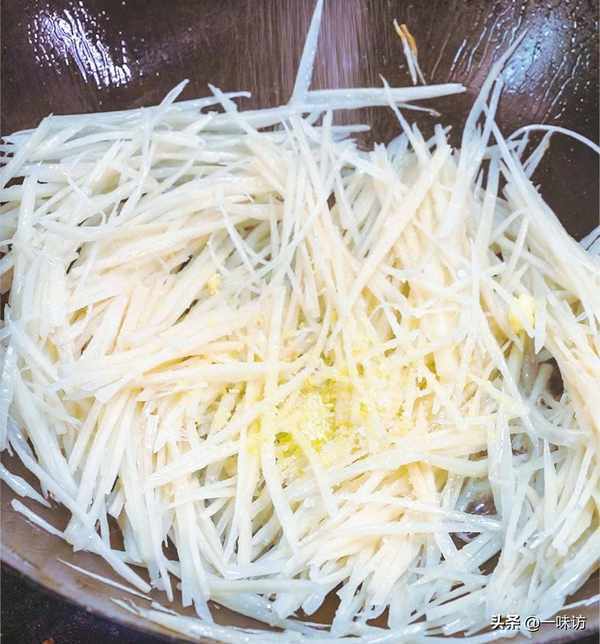 然后要轻轻地多翻搅一下,将莲藕中的淀粉给浸泡出来,这样在炒得过程中,莲藕就不容易粘锅。同时也保证了莲藕丝的清脆爽口,炒食起来更加入味,让人食欲大增。