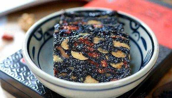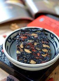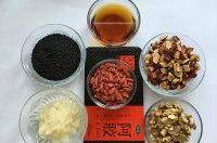 备料:阿胶110g,黑芝麻140g,核桃仁70g,红枣100g,枸杞50g,老冰糖90g,黄酒150g