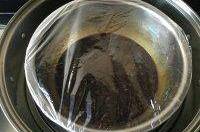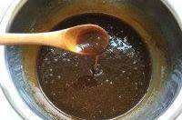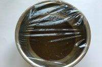 16.阿胶膏蒸好后最好不要立即倒入容器中,以防温度过高烫坏保鲜膜。需要不停的搅拌降降温,大约降至60度左右才可倒入容器中,表面盖上保鲜膜,用手压压平。放凉后送进冰箱冷藏半天或一天