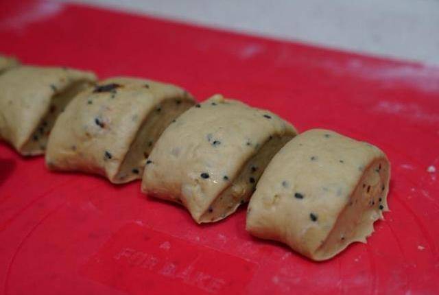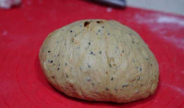 2、放入厨师机中,加入芝麻、枸杞和松子揉成面团。