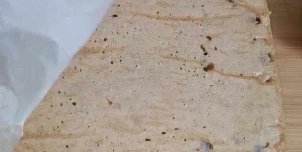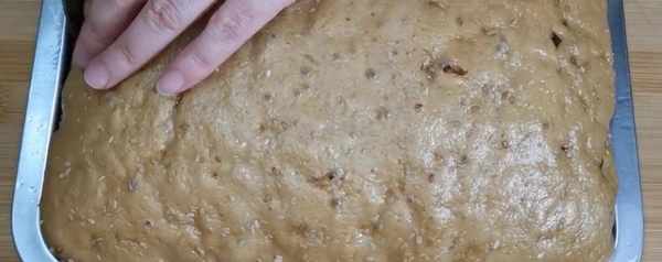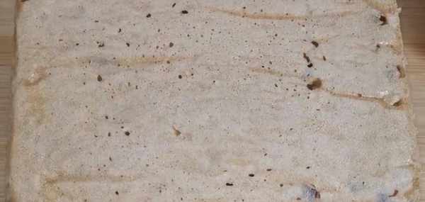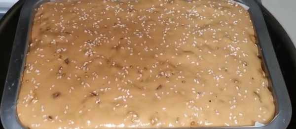 【步骤二】准备一个容器,底部铺上油纸,再往容器里刷一层油,防止粘黏,然后倒入面糊,再在铲子上刷点油,把面糊表面抹平,最后撒上少许的白芝麻,点缀一下,也可以放自己喜欢吃的果干,然后蒸锅中倒入温水,将发糕放入锅中饧发一下,温水的温度要在50度以下。