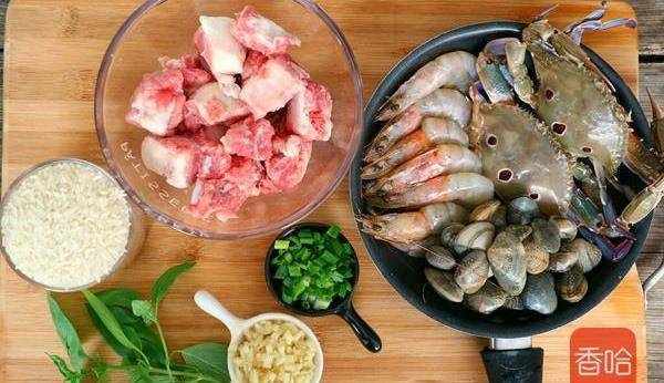 排骨2斤、大米360克、蟹6只、虾1斤、花甲半斤、姜末适量、葱花适量、白胡椒粉适量、盐适量、糖适量、酱油适量