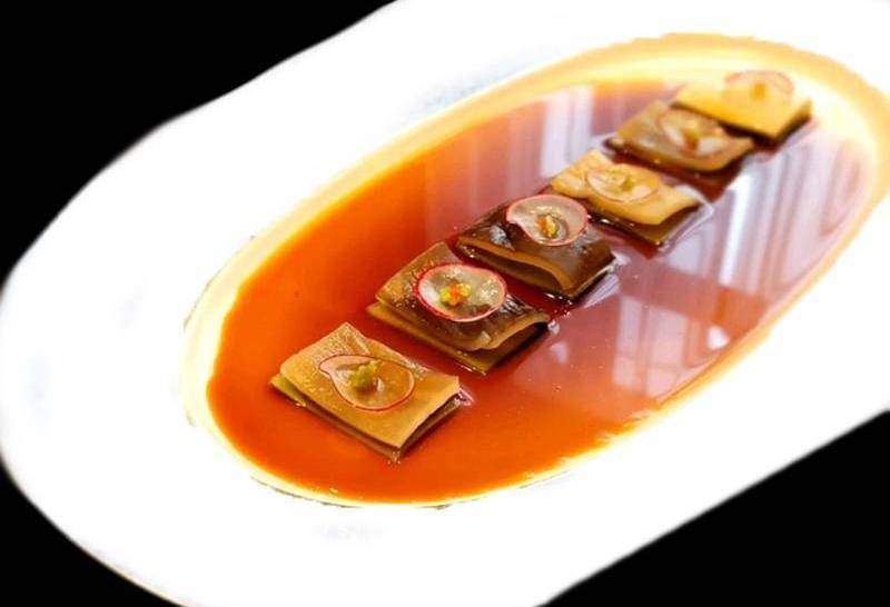 过水后的鱼唇修整外形后摆在盘中,将调制好的酱汁淋在鱼唇上,点缀萝卜片和香芹末即可上桌。