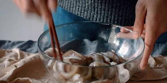 2.鱿鱼条中放入盐,放入料酒腌制