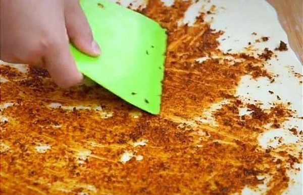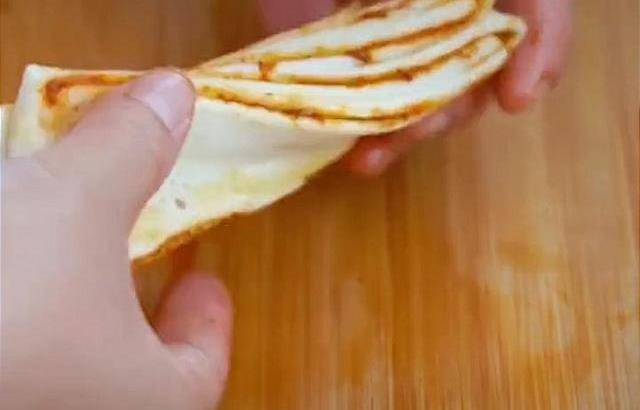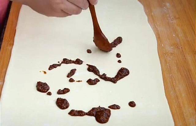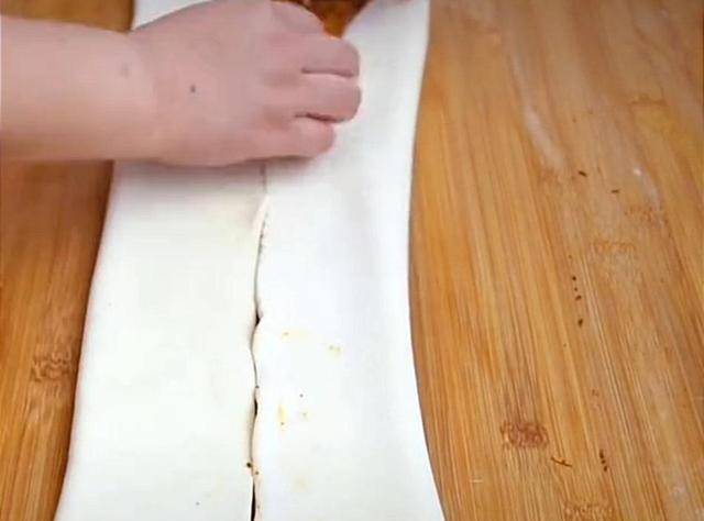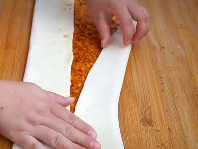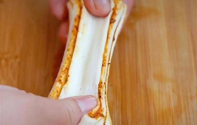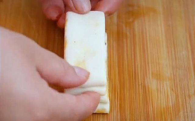 再将调好的油酥淋在面饼上,用刮板把油酥均匀的涂抹开,再将面皮上下对折起来,折成一个长条就可以了。