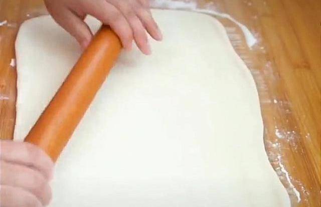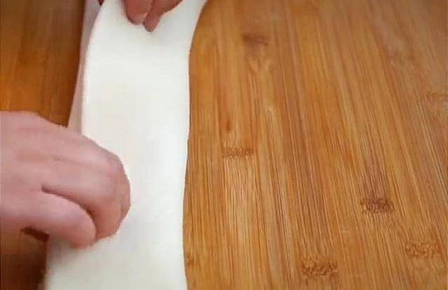 然后,将和好的面团拿出来搓成长条,用掌心压扁,擀成一个长方形的生胚,厚度在0.2厘米就行了。