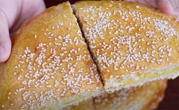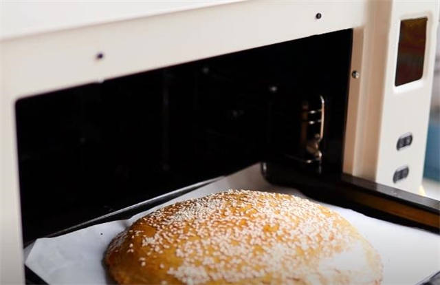 8.拿一个烤盘出来,大饼松弛好,直接放在里面,表面刷一些食用油,再撒上白芝麻,烤箱提前预热好,咱们放在中层,温度调在150度,时间选择半个小时,烤熟出锅。