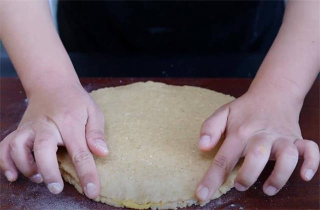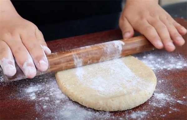 4.案板上撒些干面粉,用擀面杖压成圆饼。