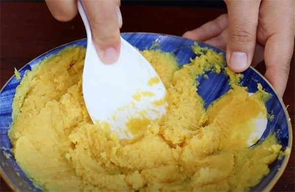 2.这个是提前蒸好的地瓜馅,用勺子捣成泥。