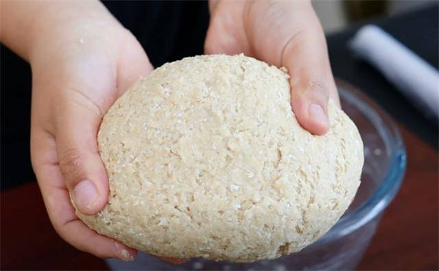 1.准备上200g的燕麦片,我这个是即食的,你们可以用生的来代替,纯牛奶放上100毫升,家里用的食用油放20g,160g的面粉,酵母粉放4g,白糖20g,燕麦的吸水率比较强,所以说揉面的时候一点都不会费力,简单的两下,揉到这种光滑的程度,密封好放到温暖的地方去发酵。