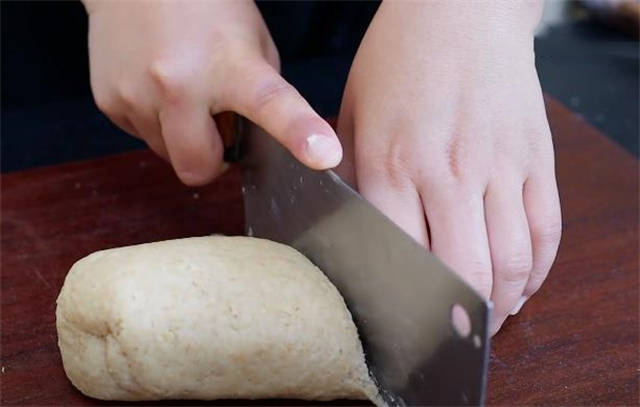 3.面团饧发好之后,咱们拿出来,稍微的揉两下排气,排好气之后简单的揉成长条,分成两个大面剂。