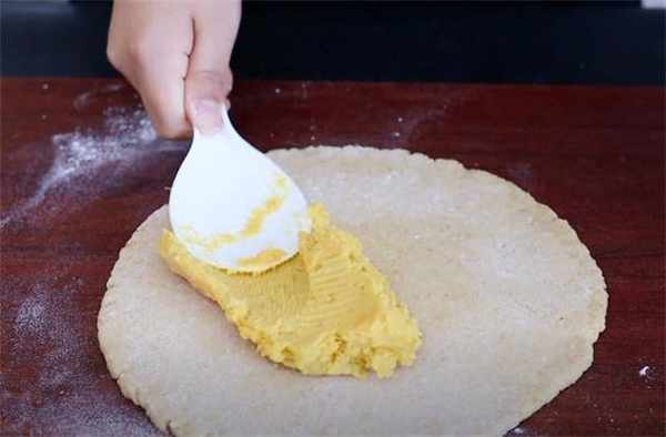5.擀好了就把刚才捣好的地瓜泥铺上去。