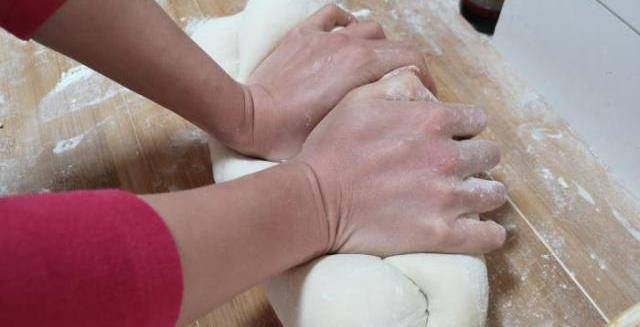 2.因为这是老面发的面,所以要揉一点碱进去,把碱搓细,搓在面板上,把碱揉进面里,大家如果和的面比较硬的话,可以选择揣碱,揣碱就是把碱用点热水融化开,然后揣进面里,那样比较省事,揉碱的话需要多揉一会。