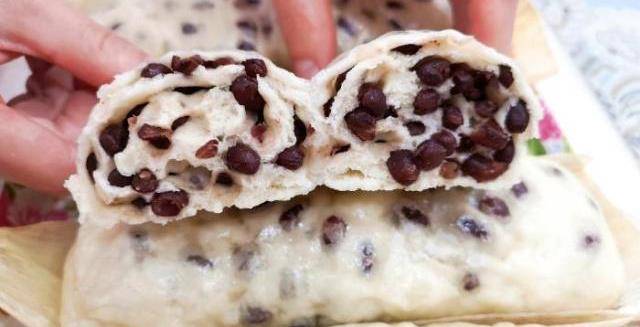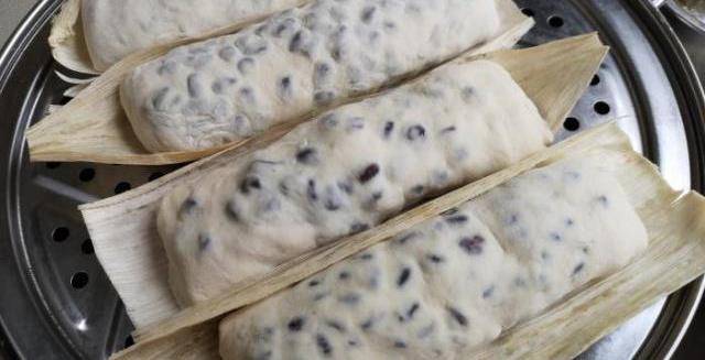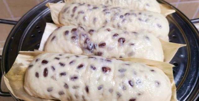 6.红豆卷下面铺一个玉米叶,放到锅内,盖上锅盖,醒发15分钟。