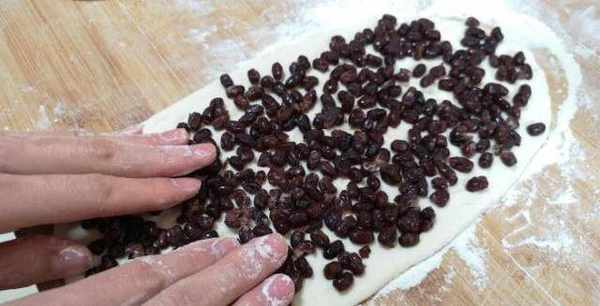 4.取一个面剂,把它按扁,用擀面杖擀成长舌状,均匀的铺上红豆粒。