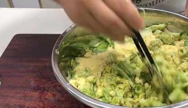 盆里加三克盐,十三香。搅拌均匀腌制10分钟。腌制好了以后打入两个鸡蛋,用筷子搅拌均匀,搅拌均匀以后加入玉米面,再次的搅拌均匀,有的人可能习惯用白面做出来不好吃的,因为白面的话它会粘在一起就会起坨,用这种玉米面它比较松散好吃,是每一个豆角都裹上玉米面。