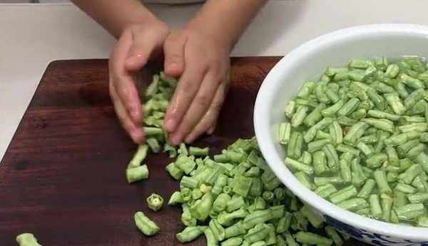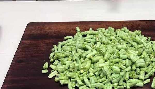 今天用老豆角来制作一块我们北方的美食,家里面吃不完的老豆角不要再扔了,我们下面开始制作,我们准备一把老豆角,老豆角之前我都摘好了,选的这种老豆角摘下来以后不要马上开始吃,要放一天就是那种豆和皮都分开的那种感觉,这样做比较好吃,切的块儿小一点儿。