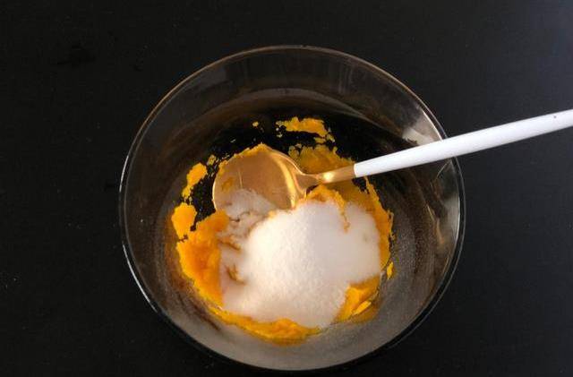 3.南瓜泥中加入细砂糖和盐搅拌均匀,糖量可以根据个人口味增减