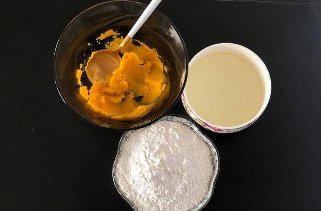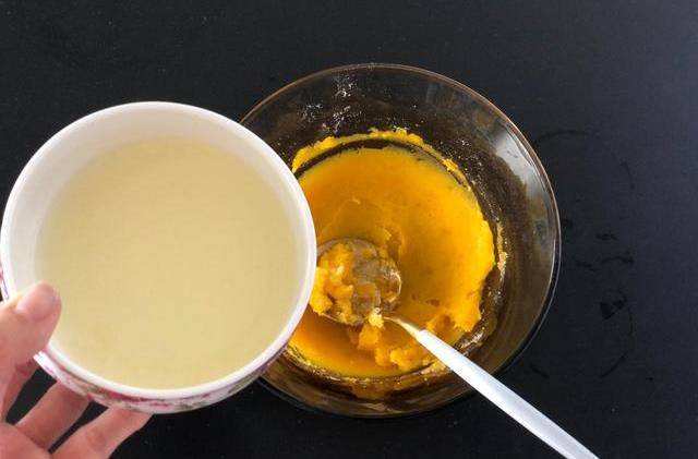 2.蒸好的南瓜取60克放入碗中碾压成泥,将清水和玉米油放入同一容器,粘米粉和泡打粉放入同一容器
