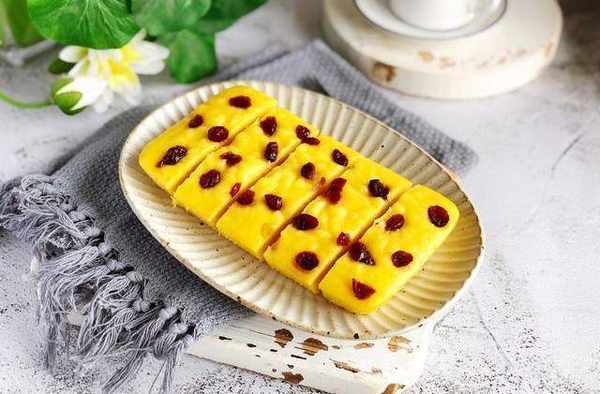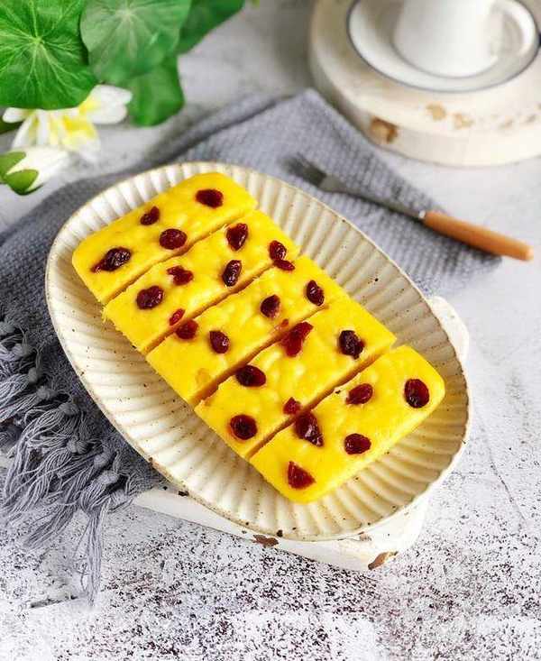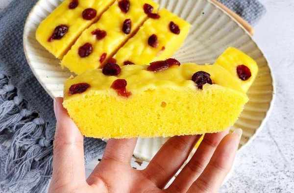 南瓜泥60克,粘米粉125克,清水100-105克,玉米油25克,泡打粉5克,细砂糖35克,盐0.5克,蔓越莓干适量