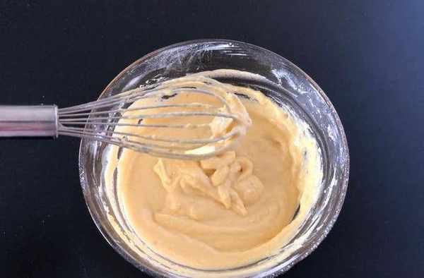 4.玉米油和清水提前充分混合均匀,用蛋抽不停搅拌1-2分钟,水油融合,倒入南瓜泥中边倒边搅拌