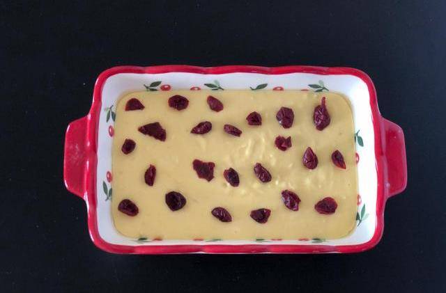 6.容器刷油,把面糊倒进去,晃动轻震面糊就会变得平整,表面摆蔓越莓干点缀