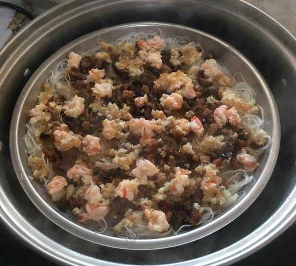 原料:米粉、鲜虾、五花肉、香菇、盐、酱油、蚝油、鸡精。