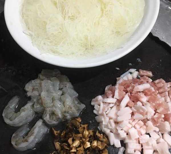 第1步、将米粉用温水泡二十分钟后,切成两段放入盘中待用。鲜虾去壳取出虾线并切段,泡好的香菇及五花肉切小丁。
