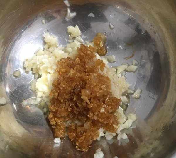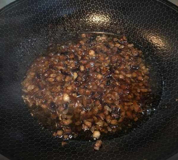 第5步、黄金蒜蓉:将一半的蒜蓉炒至金黄色捞出,倒入生的一半和匀,加入盐、鸡精。(它可以用于蒸开边虾、扇贝、带子等等)。