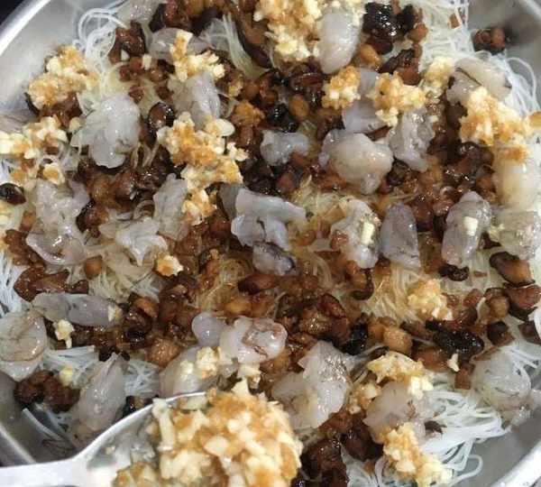 第4步、淋在提前泡好的米粉上,放入虾段并均匀地放入黄金蒜蓉。