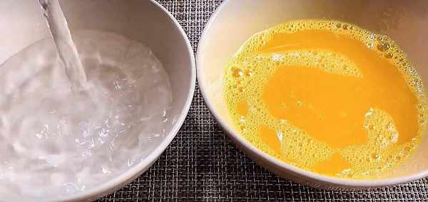 3.然后把水倒入鸡蛋液中,搅打均匀。