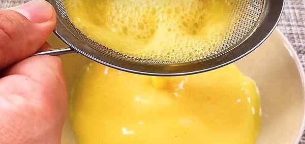4.找个滤网过滤一下,可以过滤掉没有搅拌均匀的鸡蛋疙瘩,还有去除一些气泡。