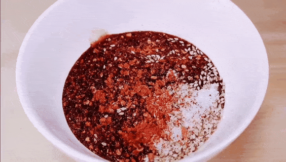 4、调酱汁:在碗里加入一勺芝麻、一勺辣椒粉、一勺糖、少许盐、生抽、醋;
