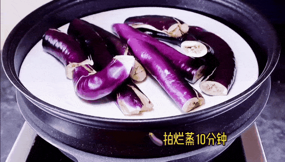 2、茄子切头拍打裂皮后,上锅蒸10分钟