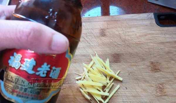 2、蛋黄酱准备好后,可以开始准备其他食材,将生姜放入水中洗净,将洗好的生姜切成生姜丝,再准备一瓶福建的旧酒放在旁边。