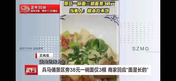 毕竟此前,西安回民街就有6根面20元事件,这次又是兵马俑景区再曝3根面38元,确实值得深思。难道当地市场监管局都不管控市场价格的吗?