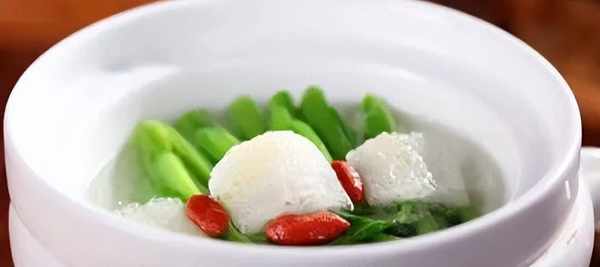 2、炒锅下水将排骨焯水,加水姜葱、料酒蒸熟待用,净锅将广东菜心、竹笙用二汤、盐、味精、鸡油煨过装入盘中、旁边放排骨、枸杞待用。