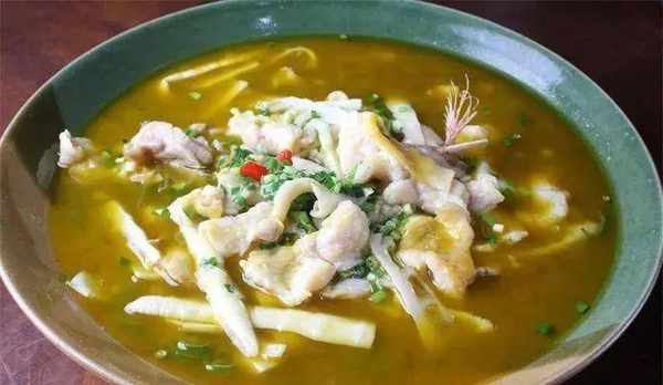 1.把黄沙鱼宰杀治净后,鱼骨斩成块,鱼肉切成片,并用姜葱汁、盐、料酒和生粉码味上浆,待用。另把鲜苦笋切成片,放入沸水锅里汆透,用清水漂2 小时后,捞出来沥水。