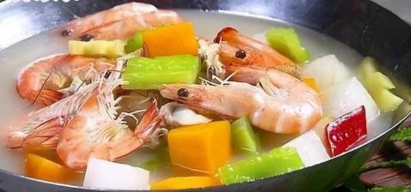 2、炒锅下水将基围虾焯水、净锅下油将小料头煸香下水、少许二汤、海蚌、冬瓜、苦瓜、金瓜煮开5-6分钟下基围虾、芹菜,用盐、味精、鸡粉调味装入锅仔中即可。