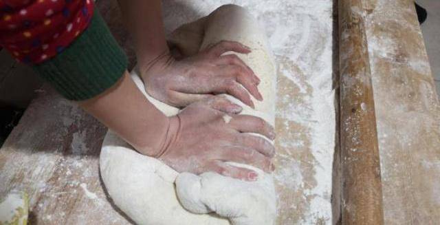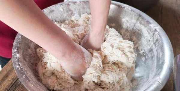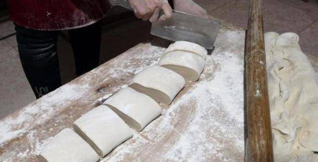 取两个面盆,每个盆内装5斤面粉,放上一包半酵母粉,搅拌均匀,边加水,边用手搅拌,把面搅拌成面絮,如果面多的话,用两个手从下往上翻。和成面絮后,下手揉面,用两只手不停的揣面,把面揉一下,揉成均匀光滑的面团。把面盆放在炕头上盖上被子,让面发酵至2倍大,这样面发的快,因为比较暖和。