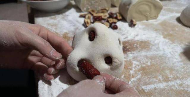5.取一个面剂使劲揉,像平时揉馒头一样,这个戗面馒头面比较硬,要用劲揉,把下面揉成一个漩涡后,再横过来继续搓,把下面都揉到一起,竖起,团一下型,把上面的干面粉都搓下来。一个馒头揉好以后,用两个小拇指在顶部穿个洞,放上一个大枣,四周的中间,分别搓一个洞,放上大枣,如果枣比较大,可以切开,每一面发一半大枣。这样一个枣花馍馍胚就做好啦!